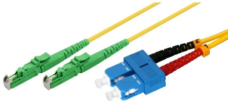 LWL Patchkabel, 9/125 µm, OS2-Faser, 2x E2000/APC 8° Stecker / SC Duplex Stecker, 0,5 m, gelb- 9/125 µm, Singlemode- OS2-Faser für 10 Gigabit/s- 2x E2000/APC 8° Stecker anSC Duplex Stecker- Huber&Suhner E2000 Stecker- mit Prüfprotokoll- 20 Jahre Garantie