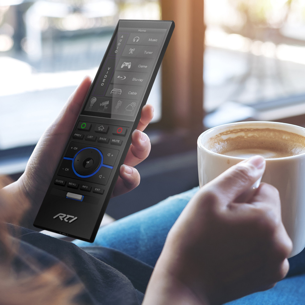 Farb Touch-Fernbedienung schwarz inkl. Akku und Dockingstation (Zigbee, RF und WiFi), flächenbündig verbautes 4" Display (kapazitiv), Griffsensor, Beschleunigungssensor, 20 programmierbare Tasten