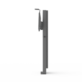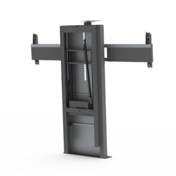 Wall/floor mount with motorised height adjustment for 2 displays up to 60kg / VESA max. 800x400. With storage possibility for devices and cables. (550x380x132 mm) For personal security, the display can be locked with the included locking screw or with a padlock (not included) for increased protection against theft. Finish: aluminium/dark grey
