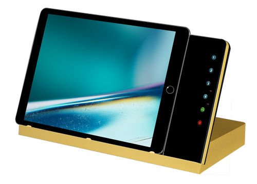 Tabletop Docking Station with charging function for horizontal format insertion of all current Apple iPads with Lightning charging port. Adjustable, sliding Lightning connector, 6-button touch keypad with control interface incorporated into glass panel. Transmission of control commands via IP directly or to a 3rd party control system. PoE+ or 110-240V powered. Anodised Aluminum base gold, black glass bezel.