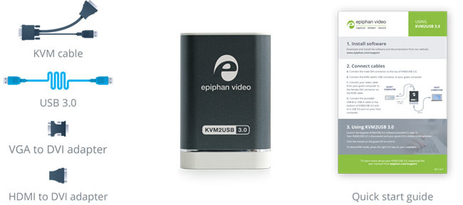 The simplest way to manage local servers and headless computers, with KVM over USB. Epiphan KVM2USB 3.0 has fewer connectors than a traditional KVM switch and is powered over USB, meaning you won’t need extra power sources and will have less cable mess.